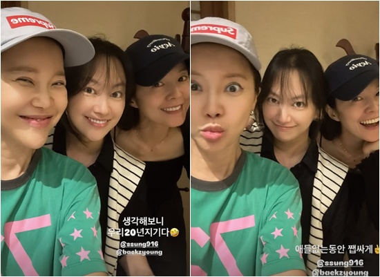 사진에는 신애가 가수 백지영, 배우 김성은과 찍은 셀카가 담겼다. 세 사람은 편안한 차림으로 환하게 웃고 있는 모습. 좀처럼 근황을 알 수 없던 신애의 모습은 특히 반가움을 자아낸다.