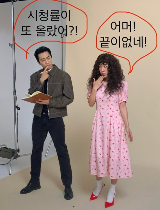 공개된 사진 속 송승헌은 엄정화와 함께 지니TV, ENA '금쪽같은 내스타' 촬영을 이어가고 있는 모습. "시청률이 또 올랐어?!", "어머! 끝이 없네!" 등의 문구를 넣어 웃음을 자아냈다.