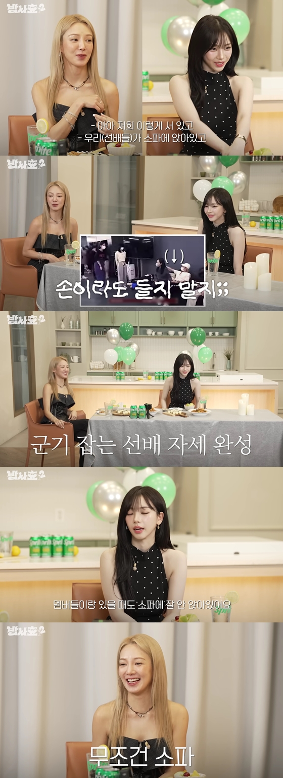 효연은 "궁금한게 있다. 우리 '갓 더 비트' 활동하면서 그 사진이 있지 않나. 우리가 소파에 앉아있고 윈터랑 카리나가 서 있는데 막 뒷짐지고 있다"라며 일명 'SM 군기짤'에 대해 언급했다.