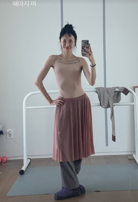 (엑스포츠뉴스 문채영 기자) 엄태웅 아내 윤혜진이 발레로 만들어진 슬림 몸매를 뽐냈다.