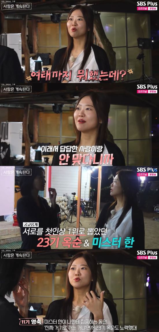 11일 방송된 SBS Plus와 ENA의 '나는 SOLO, 그 후 사랑은 계속된다'에는 11기 영숙과 미스터 한이 대화를 나누는 장면이 공개됐다.