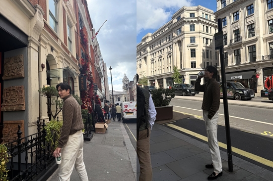 영국의 가로등 옆에 서 커피를 마시는 이진욱의 모습은 유독 그림자 진 배경이라 얼굴은 자세히 보이지 않지만, 그의 뛰어난 비율만큼은 눈길을 끈다.