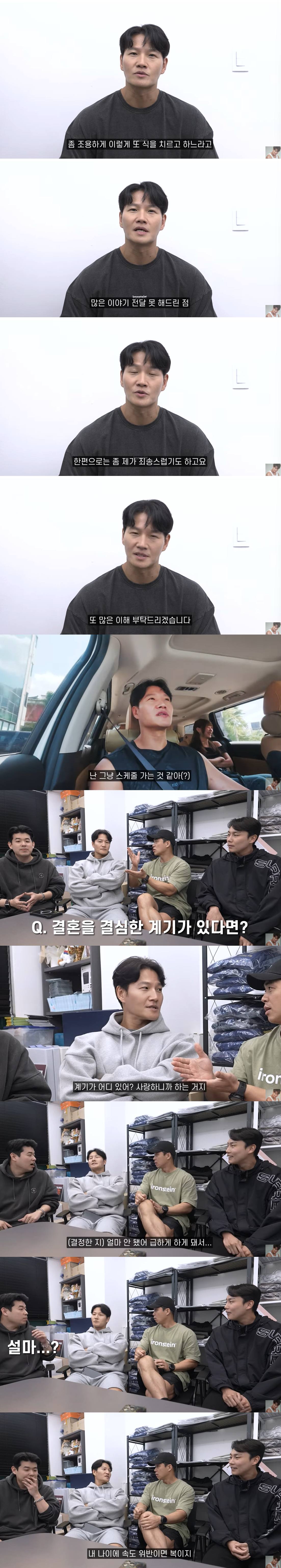 이 중 눈길을 끈 건 속도위반이 아니라고 해명한 점이다. 신부에 대한 정보를 밝히지 않고 결혼식 사진도 올리지 못하게 하며 철통보안 속 예식이 진행됐기에 임신해서 그런 것이 아니냐는 얘기가 나온 기도했다. 그러나 11일 공개한 유튜브 콘텐츠 영상에서 결혼에 대해 "아예 짐작조차 못했다"는 지인에게 김종국은 "얼마 안 됐다. 급하게 하게 돼서"라고 답하며 속도위반이 아니라고 전했다. 급하게 결혼식을 하게 됐다는 말에 속도위반이 아니냐는 질문이 들어왔기 때문. 김종국은 "아니다. 이 나이에 속도위반이면 복이지"라고 밝혔다.