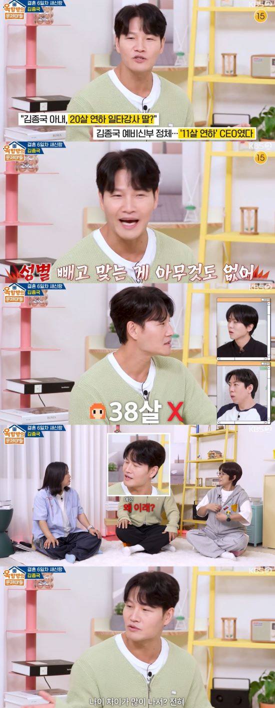 11일 KBS 2TV '옥탑방의 문제아들2'를 통해 김종국은 "지금껏 나온 가짜뉴스 중에 성별 빼고는 맞는 게 하나도 없다. 20살 연하도 아니고, 헬스 종사자도 아니다"라며 아내에 대해 밝혔다.
