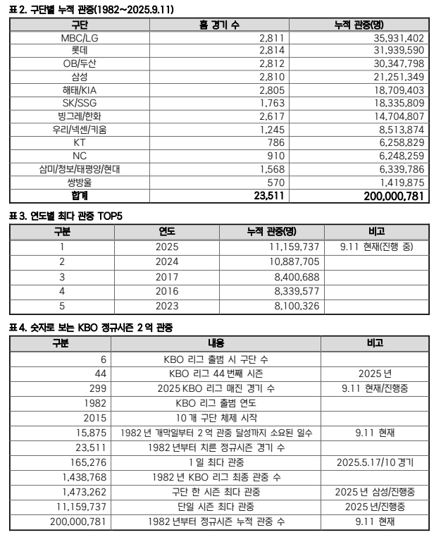 12일 한국야구위원회(KBO)에 따르면, KBO리그는 출범 첫 해인 1982년부터 지난해까지 치러진 정규시즌 2만2860경기에서 누적 1억8884만1044명으로 2억 관중 달성까지 1115만8956명을 남겨두고 2025시즌을 맞이했다. 11일까지 1115만9737명의 관중이 입장하며 정규시즌 누적 2억781명을 기록했다.