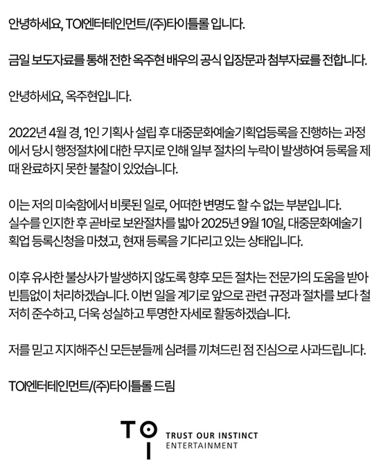 12일 옥주현은 소속사 공식 계정을 통해 "2022년 4월 경, 1인 기획사 설립 후 대중문화예술기획업등록을 진행하는 과정에서 당시 행정절차에 대한 무지로 인해 일부 절차의 누락이 발생하여 등록을 제때 완료하지 못한 불찰이 있었다"고 잘못을 인정했다.