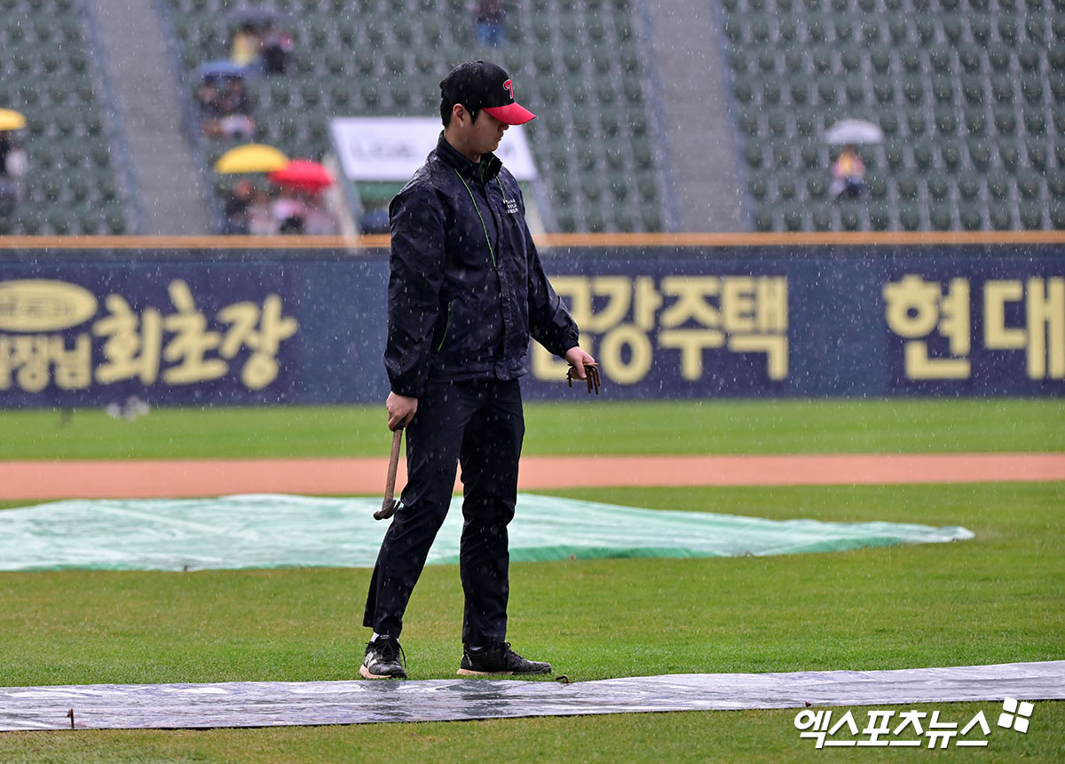 변수가 등장한 건 오후 5시 30분께였다. 잠실야구장에 비가 내리면서 그라운드에 방수포가 설치됐다.