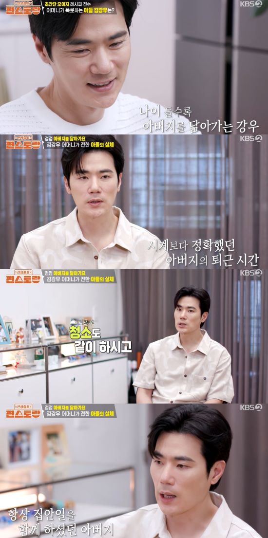 김강우는 아버지에 대해 "술, 담배를 안 하셨다. 다섯시에서 다섯시 반이면 집에 오셨다. 청소도 같이 하고, 남녀 구분 없이 집안일을 다 같이 했다"라고 설명했다. 그러면서 "다 그렇게 사는 줄 알았다"라고 덧붙였다.