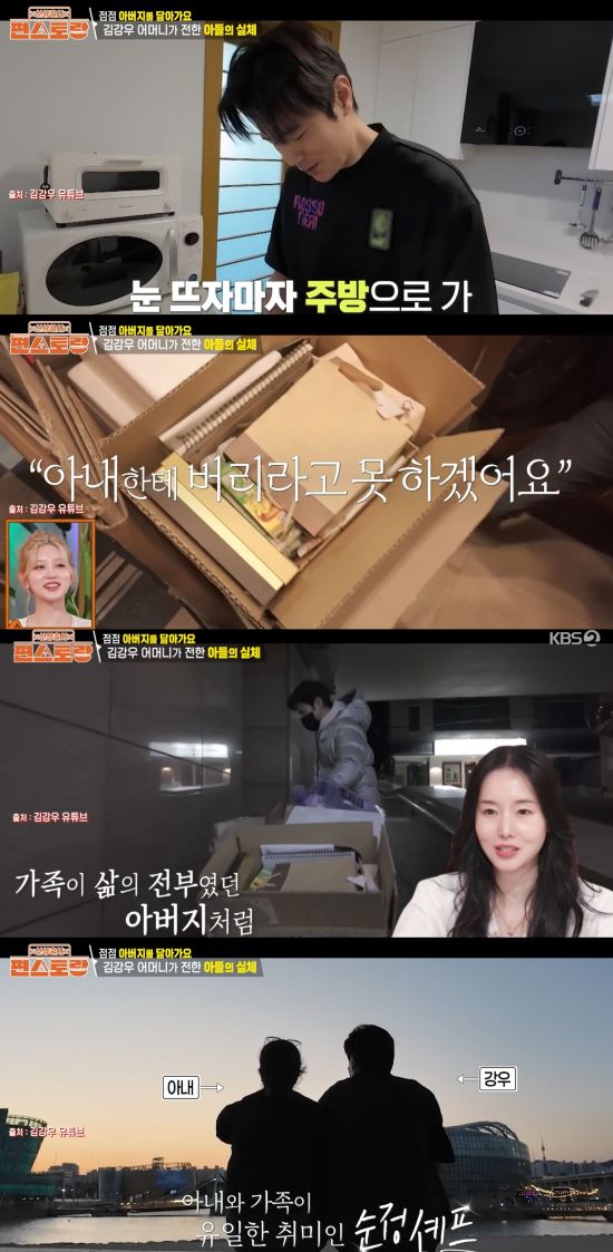 이어 김강우의 유튜브 채널 속 가정적인 면모가 드러난 장면이 자료 화면으로 공개됐다. 자료 화면에는 아침에 일어나자마자 가족들을 위해 주방으로 가 요리를 하는 장면과 분리수거를 하는 모습이 담겼다. 또 "저는 재활용 쓰레기는 여자한테 버리라고 못 하겠더라"라는 김강우의 발언에 자료 화면을 보던 이정현은 "최고의 남편이다. 저렇게 불평, 불만 없이 쓰레기를 버리시다니"라며 감탄했다.