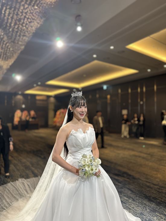 엑스포츠뉴스가 입수한 결혼식 사진에서 김한나는 오프숄더 드레스를 착용해 가녀린 어깨라인을 자랑했다. 볼륨감 있는 A라인 드레스 디자인이 김한나의 러블리한 분위기를 더욱 돋보이게 했다. 작은 왕관 형태의 티아라를 착용, 화려함을 더했다. 또한 김정석은 블랙 컬러의 턱시도를 착용해 듬직한 모습을 보여줬다.