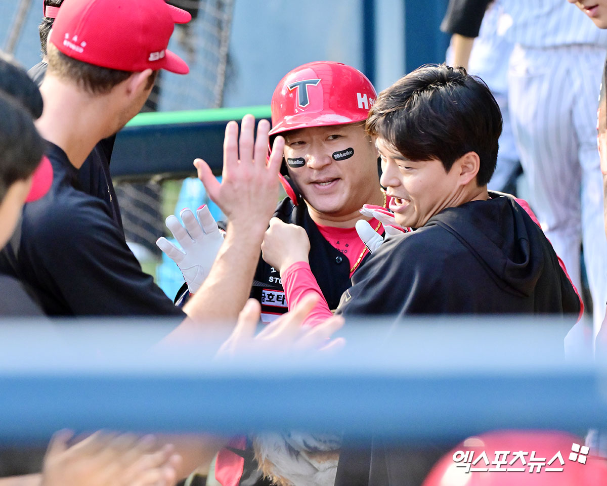 (엑스포츠뉴스 잠실, 김한준 기자) 13일 오후 서울 송파구 잠실야구장에서 열린 '2025 신한 SOL Bank KBO리그' KIA 타이거즈와 LG 트윈스의 경기, 6회초 KIA 최형우가 솔로 홈런을 날린 후 더그아웃에서 축하를 받고 있다.