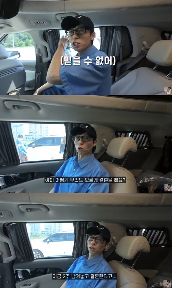 촬영장에 도착해서는 '런닝맨' PD에게 먼저 소식을 전했고, 유재석에게도 결혼 소식을 말했다.