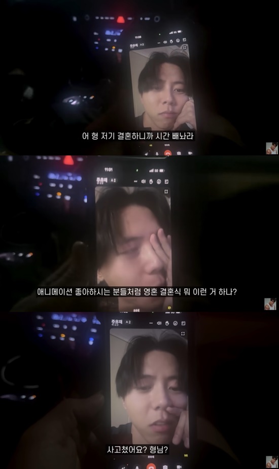 "형 결혼하니까 시간 빼놔라"는 말에 주우재는 "술 드셨냐. 밤 11시 반에 갑자기 영상 통화 되냐고 물어본 다음에 한다는 말이 지금"이라며 믿지 않았다.