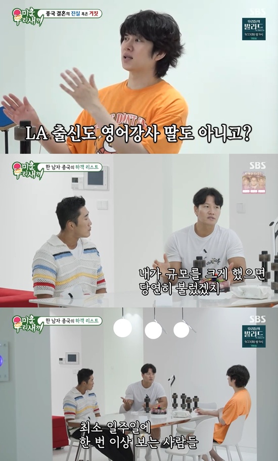 또 김희철은 "'미우새' 팀은 왜 안 불렀냐"라며 섭섭함을 드러냈다. 결혼식에 초대받지 못한 것. 이에 김종국은 "결혼식을 워낙 작게 한다"며 신부, 신랑 각 50석씩 총 100석밖에 하객을 받지 않았다고 했다.