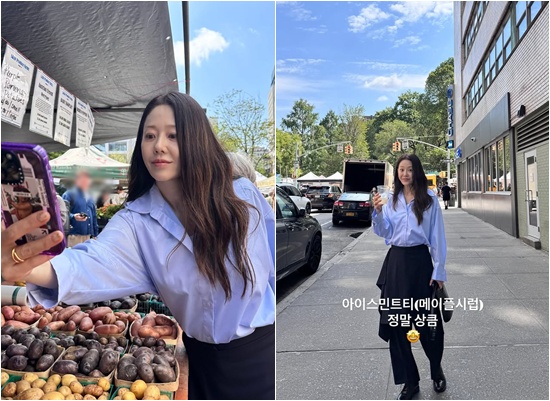 사진 속 고현정은 미국의 마켓에서 셀카를 찍고 있다. 푸른 하늘과 잘 어울리는 깔끔한 블루 셔츠와 자연스러운 헤어스타일이 조화를 이루며 청량한 분위기를 자아낸다.