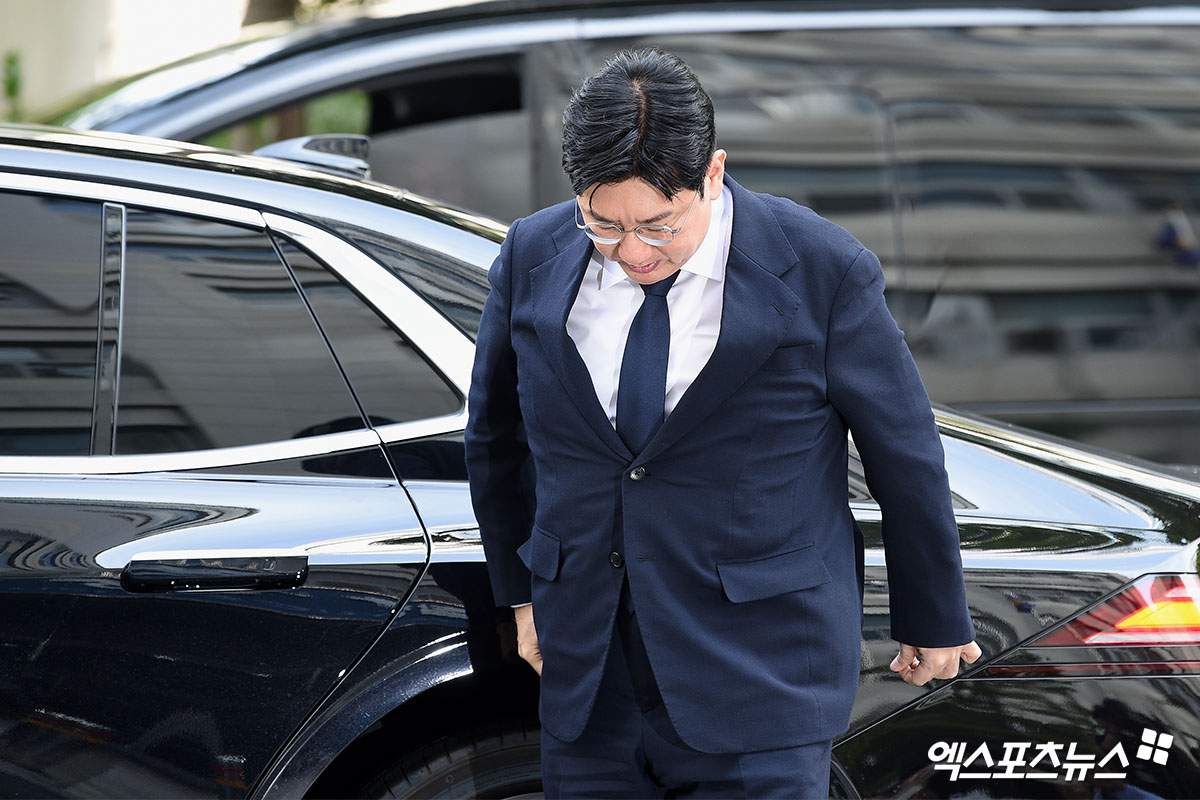 방시혁, 포토라인서 고개 숙였다… 부정거래 의혹→경찰 조사 후 달라질까 (엑's 현장)[종합]