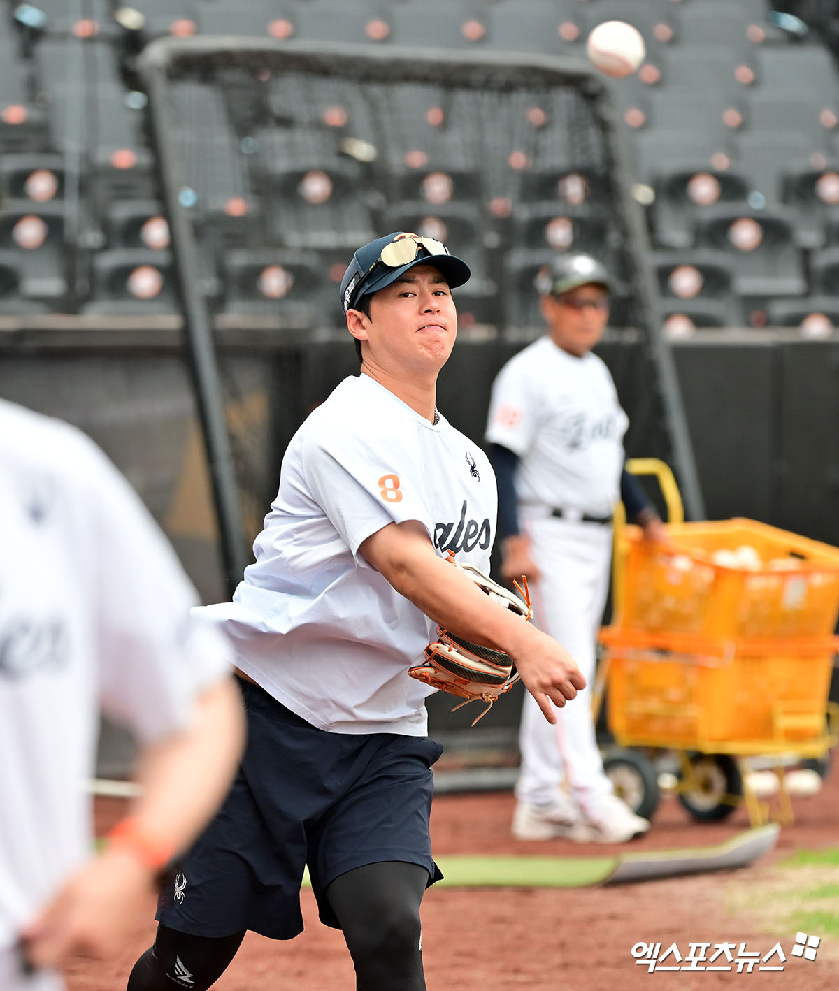 (엑스포츠뉴스 대전, 김한준 기자) 15일 오후 대전 한화생명 볼파크에서 열리는 '2025 신한 SOL Bank KBO리그' 키움 히어로즈와 한화 이글스의 경기, 한화 노시환이 훈련에 임하고 있다.