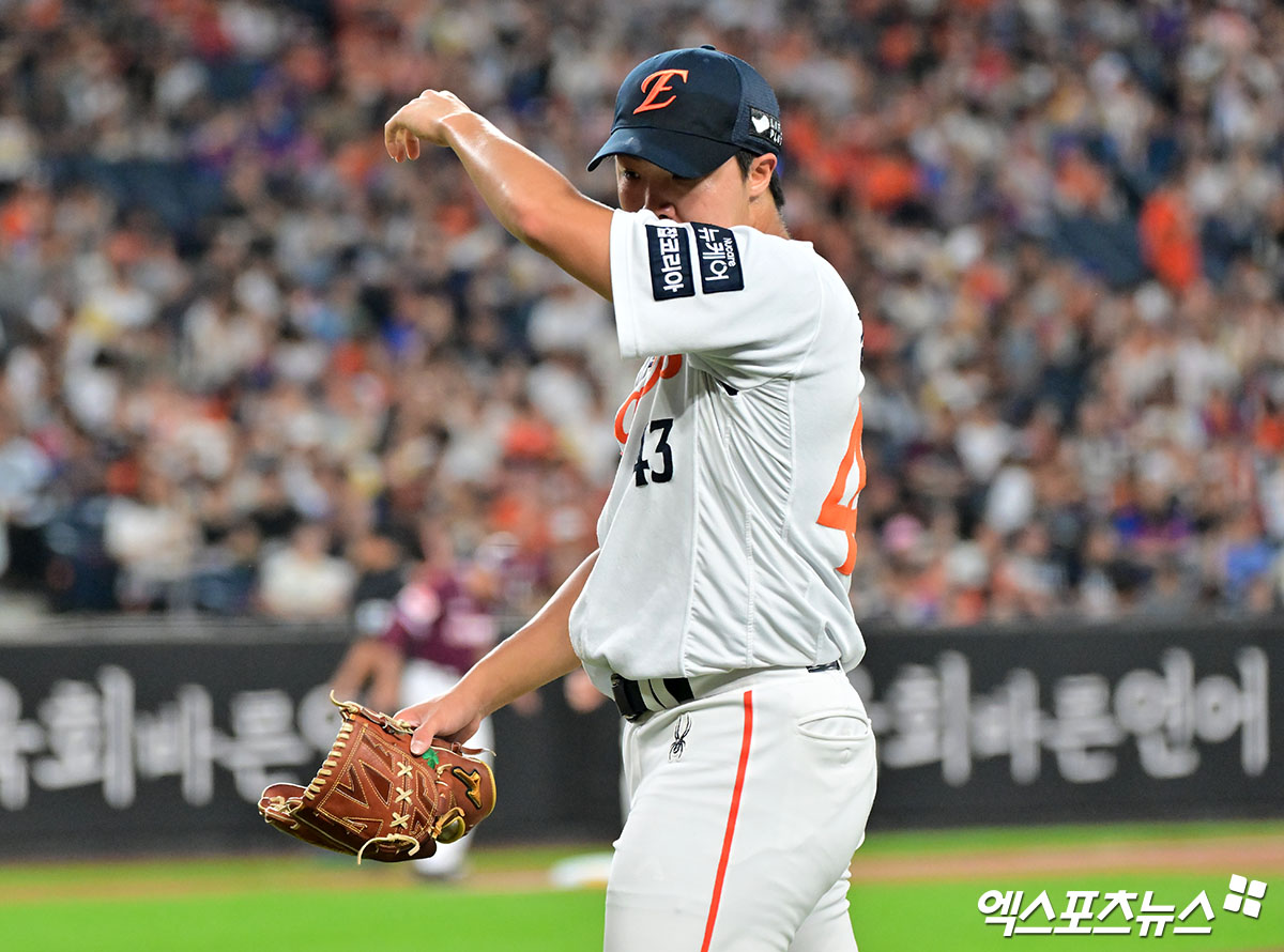 (엑스포츠뉴스 대전, 김한준 기자) 15일 오후 대전 한화생명 볼파크에서 열린 '2025 신한 SOL Bank KBO리그' 키움 히어로즈와 한화 이글스의 경기, 1회초 수비를 마친 한화 정우주가 더그아웃으로 향하고 있다.