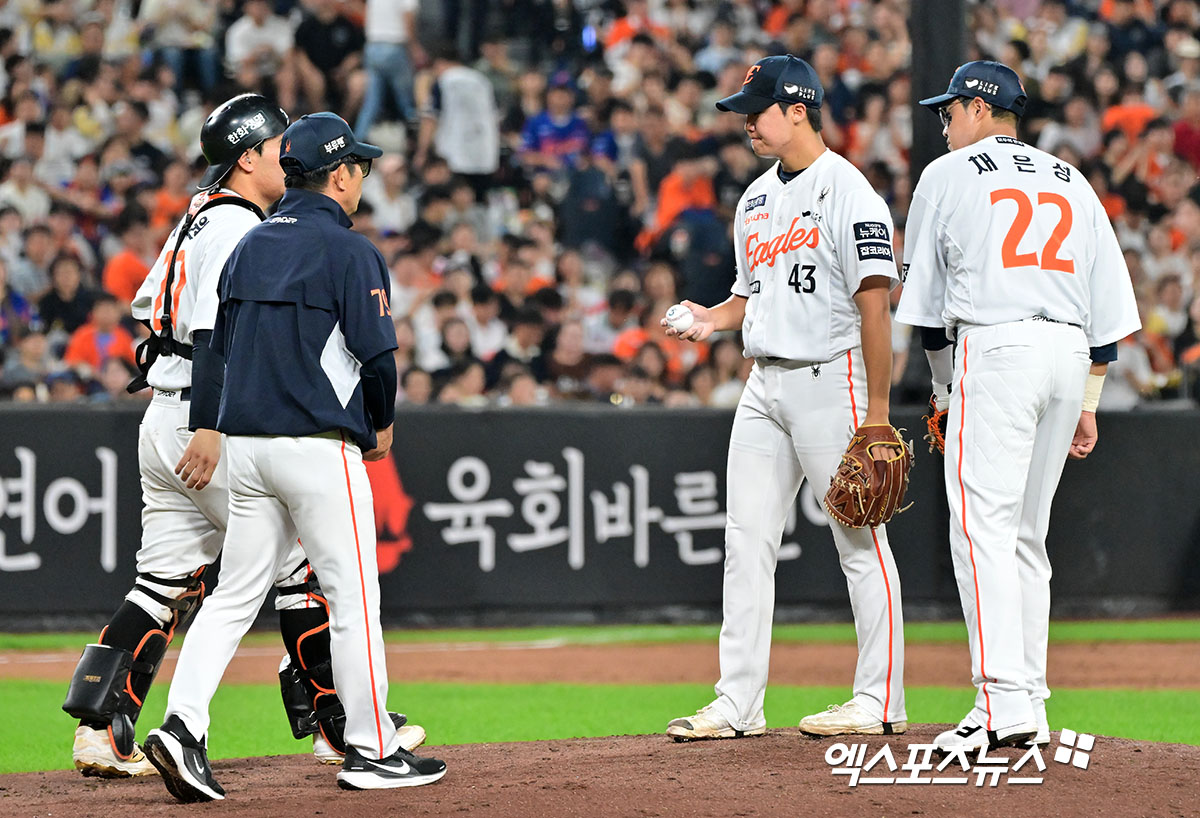 (엑스포츠뉴스 대전, 김한준 기자) 15일 오후 대전 한화생명 볼파크에서 열린 '2025 신한 SOL Bank KBO리그' 키움 히어로즈와 한화 이글스의 경기, 3회초 1사 1,3루 한화 정우주가 마운드를 내려가고 있다.