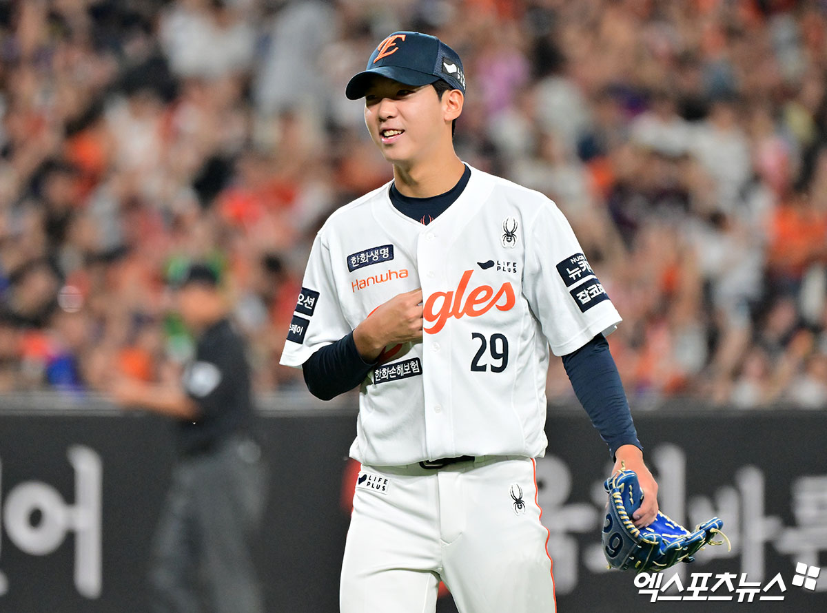 (엑스포츠뉴스 대전, 김한준 기자) 15일 오후 대전 한화생명 볼파크에서 열린 '2025 신한 SOL Bank KBO리그' 키움 히어로즈와 한화 이글스의 경기, 3회초 수비를 마친 한화 황준서가 더그아웃으로 향하고 있다.