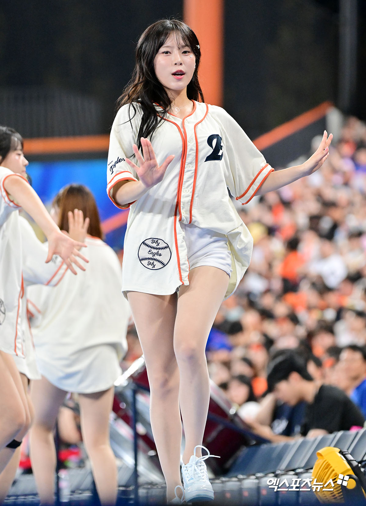 (엑스포츠뉴스 대전, 김한준 기자) 15일 오후 대전 한화생명 볼파크에서 열린 '2025 신한 SOL Bank KBO리그' 키움 히어로즈와 한화 이글스의 경기, 유진경 치어리더가 멋진 공연을 선보이고 있다.