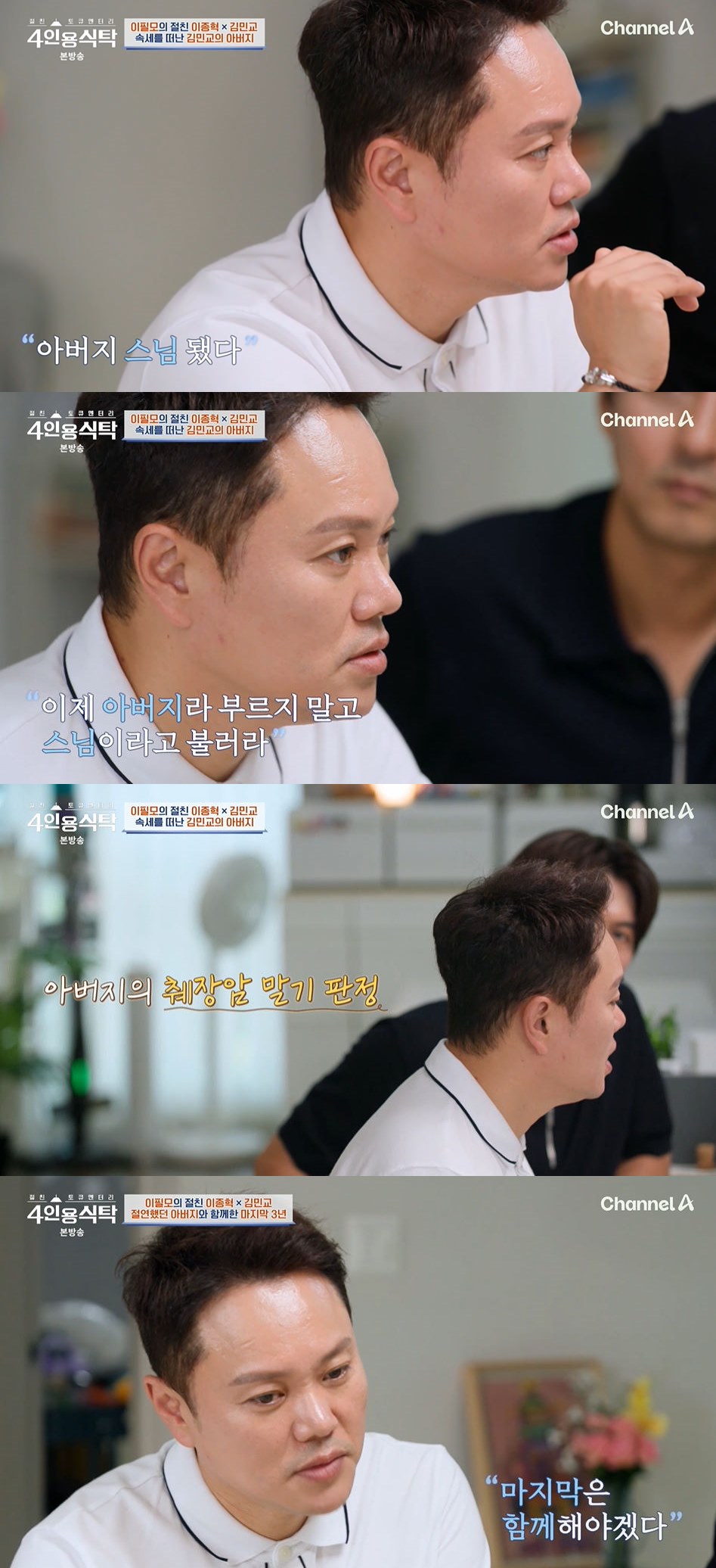 또 "군대 첫 휴가를 나왔는데 어머니가 '아버지 스님 됐다'라고 하셨다. 아버지가 큰 사기를 당하시고 세상에 대해 환멸을 느끼셔서 머리를 깎으시고 절에 들어가셨다. '아버지'하고 인사를 했더니 '이제 아버지라 부르지 말고 스님이라고 불러라'고 했다"라며 아버지가 절에 들어가신 사연을 공개했다.