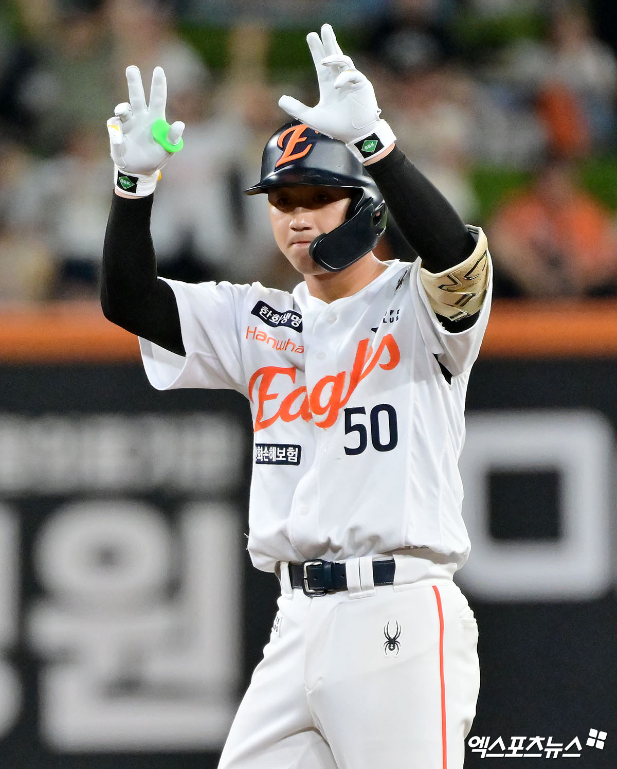 (엑스포츠뉴스 대전, 김한준 기자) 15일 오후 대전 한화생명 볼파크에서 열린 '2025 신한 SOL Bank KBO리그' 키움 히어로즈와 한화 이글스의 경기, 8회말 한화 이원석이 2루타를 날리고 있다.