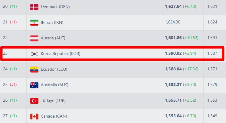 친선전이라 얻을 수 있는 FIFA 랭킹 포인트는 적지만 순위가 더 높은 팀 상대로 승점을 얻었기에, 매체는 한국의 랭킹 포인트가 2.94점 늘어난 1590.02점이 돼 23위 자리를 유지할 수 있을 것으로 내다봤다.