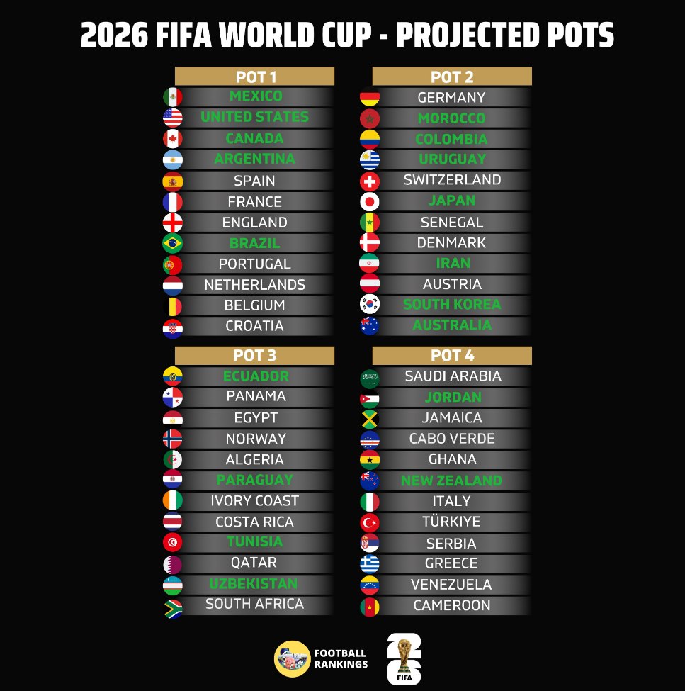 조별리그 추첨 때 개최국인 미국, 멕시코 캐나다는 본선 진출이 확정된 국가들 중 FIFA 랭킹이 가장 높은 9개국과 포트1에 배정된다.