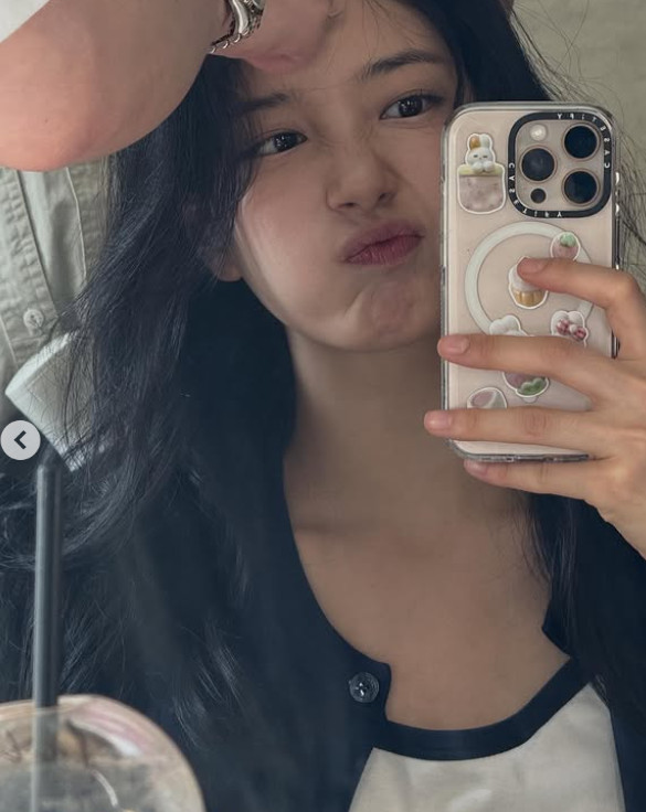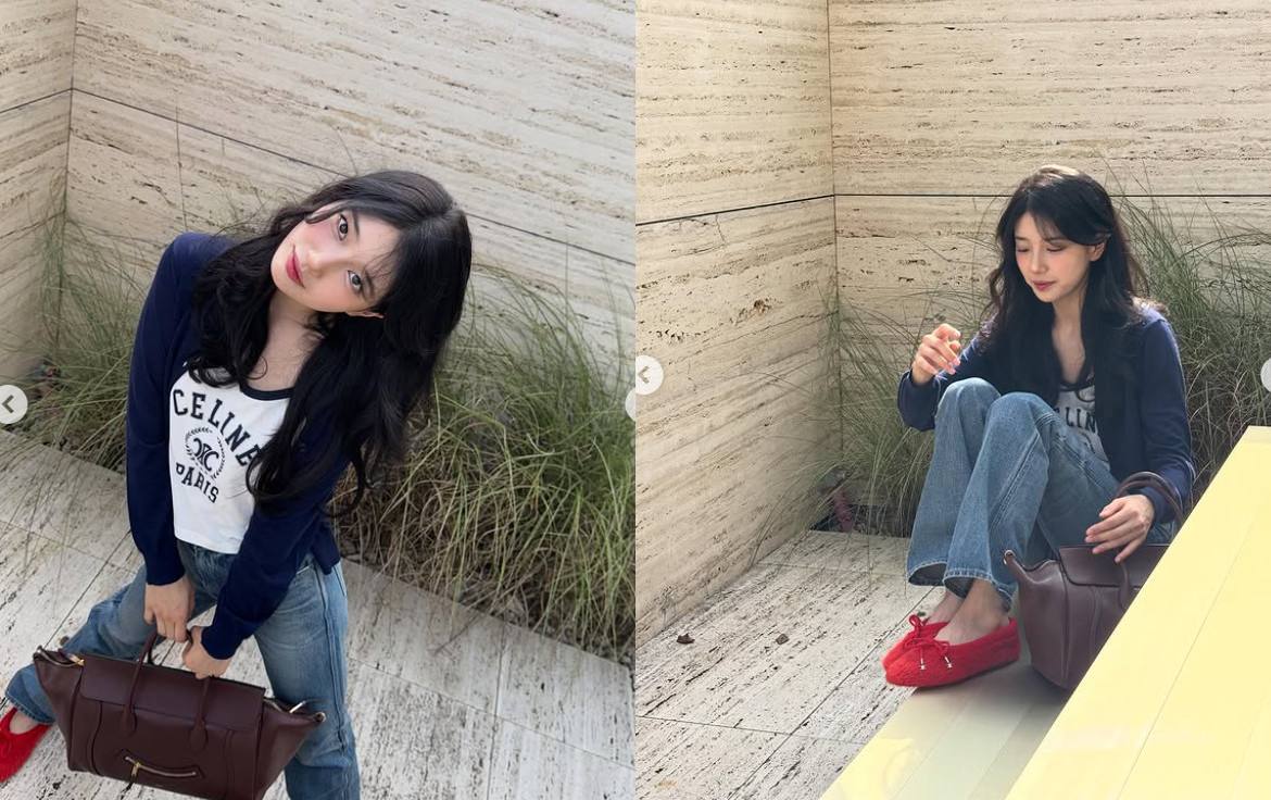 그녀가 선택한 와이드 스트레이트 핏의 청바지는 편안하면서도 슬림해 보이는 실루엣을 연출하며, 캐주얼한 분위기를 한층 살렸다. 여기에 강렬한 레드 플랫 슈즈를 포인트 아이템으로 활용해 스타일링에 생기를 더했다.