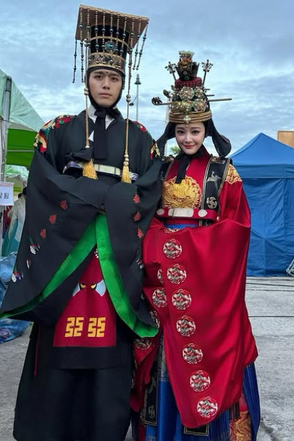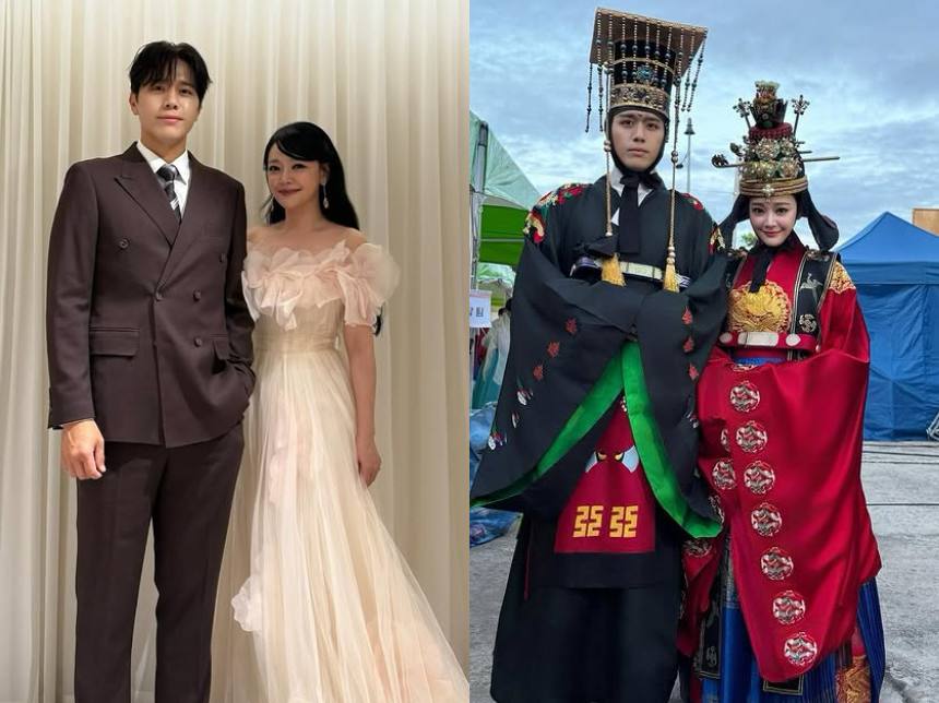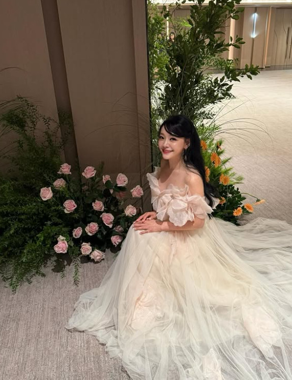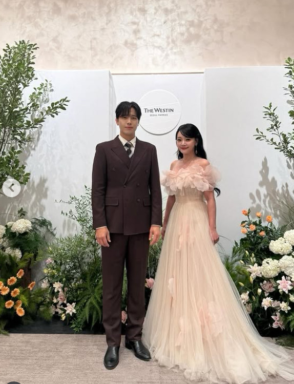 김소현은 부드러운 살구빛 오프숄더 드레스에 풍성한 플라워 디테일을 더한 스타일로 눈길을 사로잡았다. 긴 웨이브 헤어와 자연스러운 미소는 한층 우아하고 로맨틱한 분위기를 완성해 시선을 모았다. 손준호는 짙은 브라운 컬러의 더블 슈트와 단정한 타이를 매치해 품격 있는 스타일을 보여줬다.