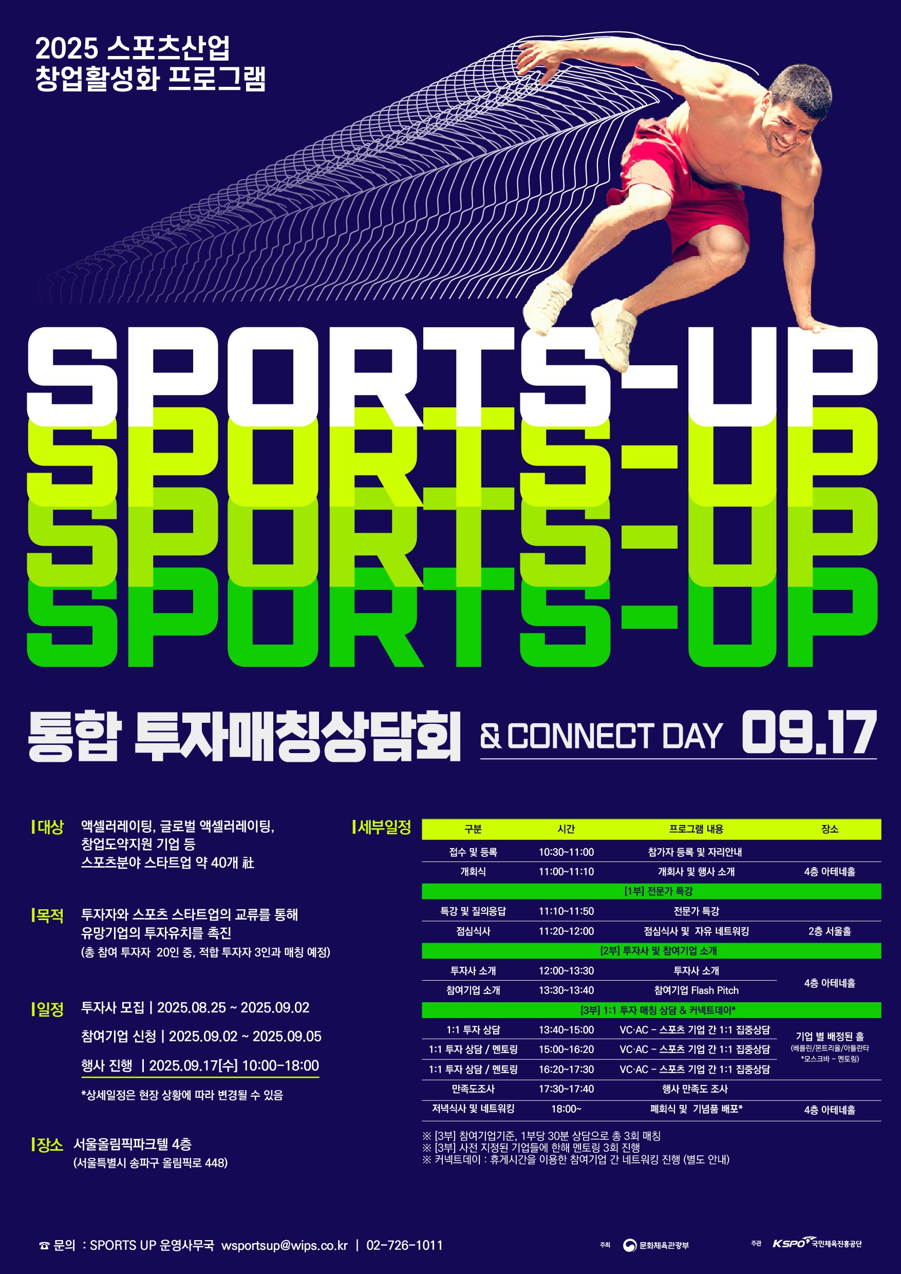 (엑스포츠뉴스 나승우 기자) 서울올림픽기념국민체육진흥공단(이사장 하형주)이 문화체육관광부(장관 최휘영)와 함께 스포츠 기업 성장 지원을 위한 ‘2025년 하반기 스포츠산업 투자 매칭 상담회’를 연다.