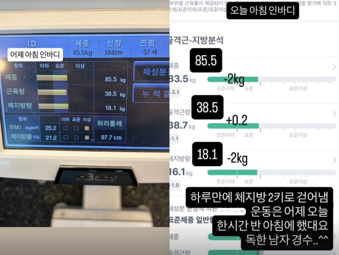 여기에 다음날 오전 인바디 결과도 함께 공개됐고, 하루 만에 체중과 체지방량 모두 2kg이 줄어든 83.5.kg, 16.1kg 이 체중이 찍혀 있어 놀람움을 자아낸다.