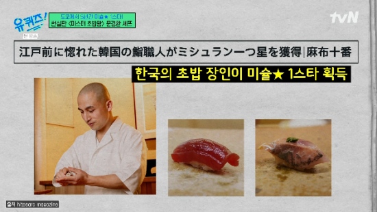 17일 방송된 tvN 예능 프로그램 '유 퀴즈 온 더 블럭'에서는 '미스터 초밥왕' 만화책을 보고 일본 도쿄에서 5년 연속 미슐랭 1스타에 오른 문경환 셰프가 출연해 이야기를 나눴다.