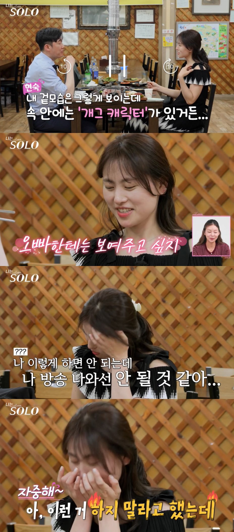 현숙은 "내 속 안에 '개그 캐릭터'가 있다. 방송에서는 끝까지 보여줄 수 없다. 오빠한테는 보여주고 싶다. 내가 패를 안 까서 그렇다. 그동안 철벽이었다"며 상철에게 어필했다.