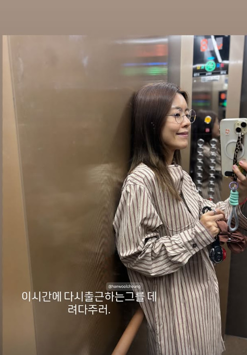 사진 속 이윤지는 엘리베이터 안에서 편안한 차림에 환한 미소를 지으며 남편을 배웅하는 모습이다.