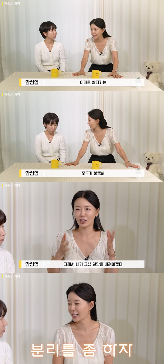 이날 안선영은 "제가 제 욕심에 '가정의 대부분의 경제적인 모든 것들을 내가 다 떠안고 있었으니까 내가 결정할 수 있어. 우린 다 같이 살아야 돼'라고 했다"라고 말했다.