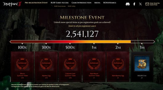 한편, 지난 5일 사전예약을 시작한 ‘로한2 글로벌’은 19일 오전 기준 사전예약 수 250만을 돌파했다. 넥써쓰와 플레이위드코리아는 이용자들의 높은 호응에 보답하기 위해, 사전예약 수에 따라 보상을 지급하는 마일스톤 이벤트의 최대 목표를 기존 200만에서 300만으로 확대하고 게임 재화 50만 크론을 추가 보상으로 제공한다.