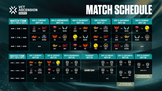 이번 어센션 퍼시픽은 총 12일간 진행된다. 조별 리그는 10월 14일(화)부터 21일(화)까지, 플레이오프는 22일(수)부터 26일(일)까지 열린다. 상위 브래킷 결승전은 25일(토), 하위 브래킷 결승전은 26일(일) 열린다.
