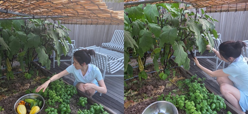 최근에는 개인 계정을 통해 남편과 함께 텃밭에서 채소와 과일을 수확하는 주말 일상을 공개했다. 그는 "주말 여름 뭘 해 먹을까"라는 글과 함께 참외, 호박, 방울토마토 등 풍성하게 자란 작물을 들고 있는 사진을 게재했다.