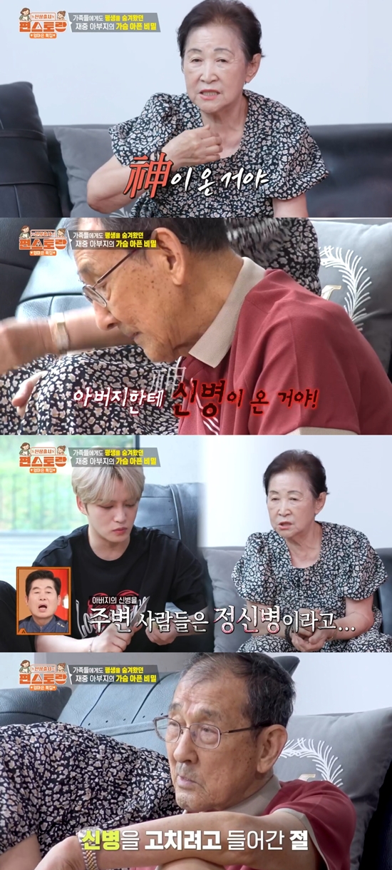 김재중의 부친은 "(사업 실패 후) 내가 홱 돌았다. 사람을 알아보지도 못해서 다들 미쳤다고 했다"라고 말했다. 모친은 "(남편이) 화병, 우울증, 정신착란까지 왔다"라고 덧붙였다.