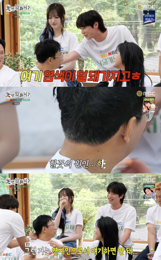 박명수는 "뭐가 피곤하냐? 내가 너한테 시켰니?"라며 발끈하는 모습을 보였고, 이준영은 "그것보다 여기 염색이 덜 돼가지고... 뒷머리에 흰머리가 보이다 안 보였다 한다"며 매의 눈 모습을 보여 웃음을 자아냈다.