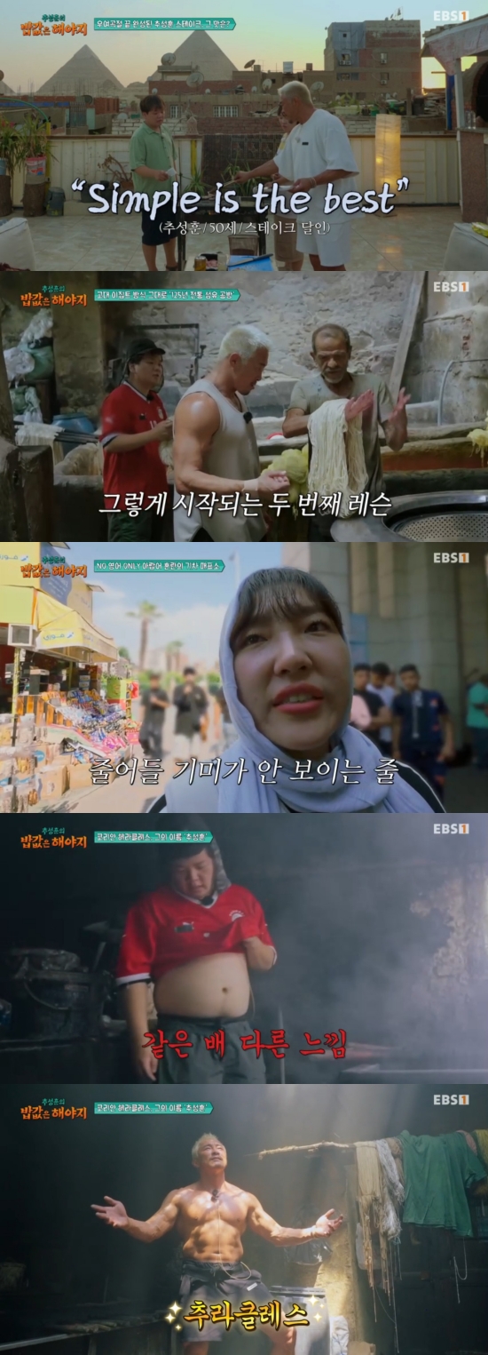 20일 방송된 ENA·EBS '추성훈의 밥값은 해야지'(이하 '밥값')에서는 피라미드 앞 추성훈 스테이크를 먹는 추성훈, 곽준빈, 이은지의 모습이 그려졌다.