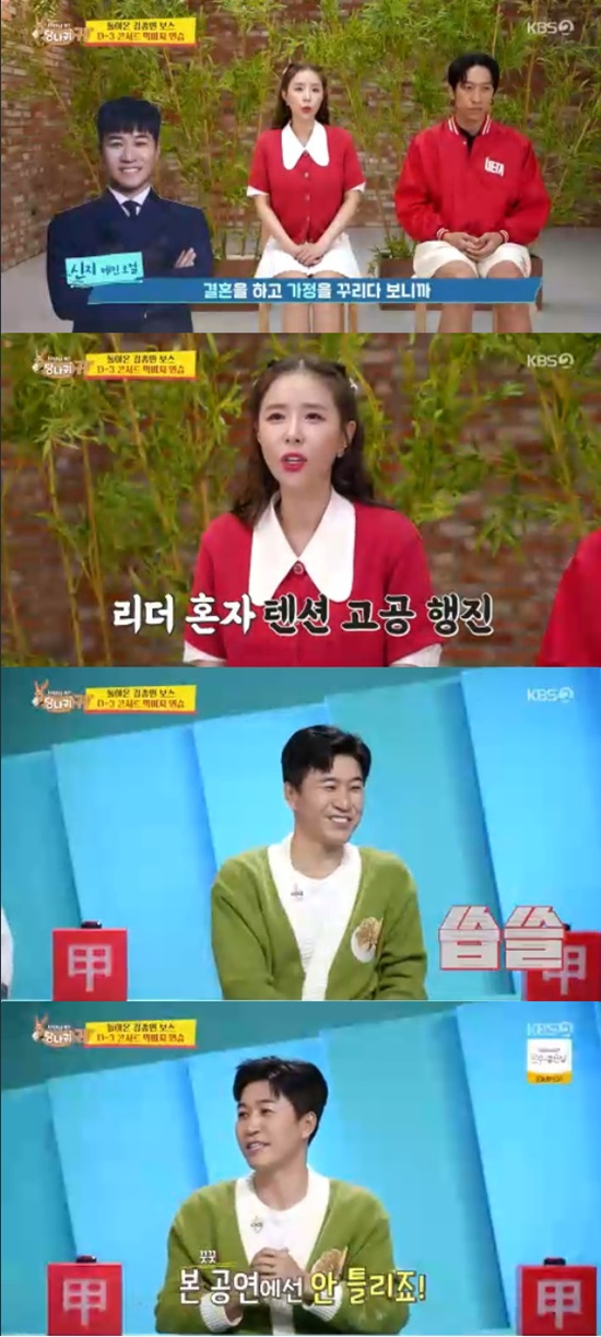 김종민은 "예전에는 뒤에서 서포트 했다면 이제는 앞에서 끌어주는 리더로 거듭나고 있다"고 자화자찬을 했다.