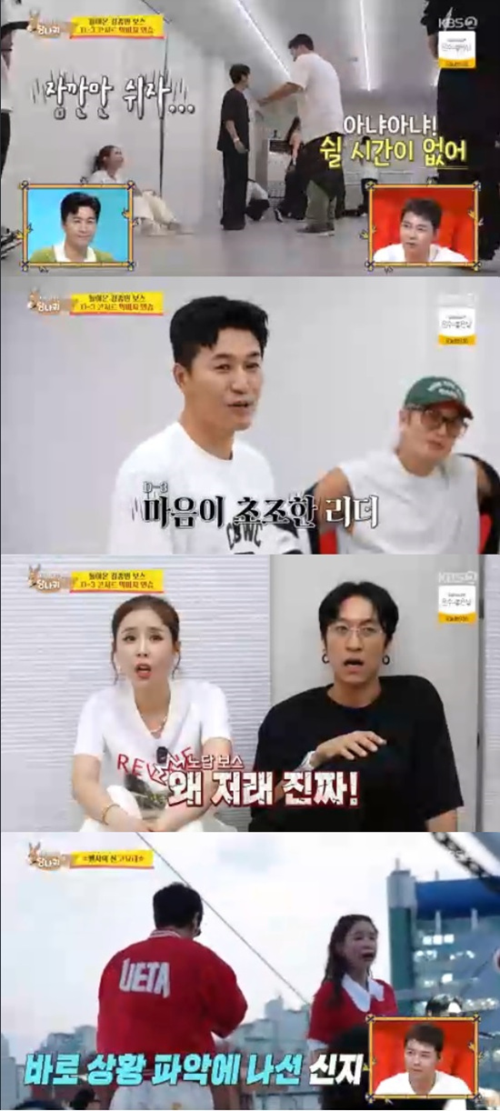 신지는 김종민을 두고 "결혼하고 가정을 꾸리다 보니까 너무 과하게 책임감과 리더십을 장착해서 혼자 텐션이 올라갔다. 오답도 아니고 노답이다"라고 한숨을 내쉬었다.