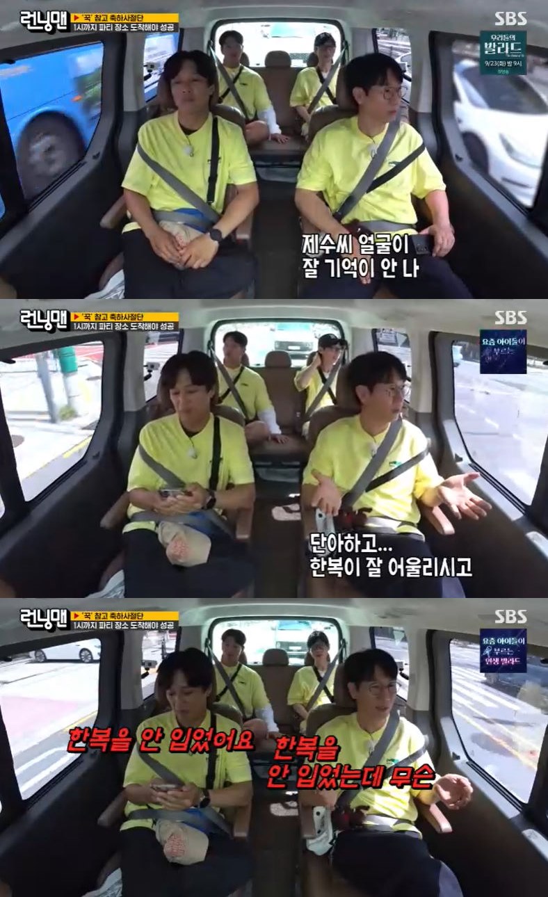 '노련한 팀'이 탄 차 안에서 지석진은 김종국에게 "난 걱정하지 마라. 사람들이 많이 물어보는데, 난 제수씨 얼굴이 기억 안 난다. 단아하고 한복이 잘 어울리시는 느낌이었다"라고 전했다.