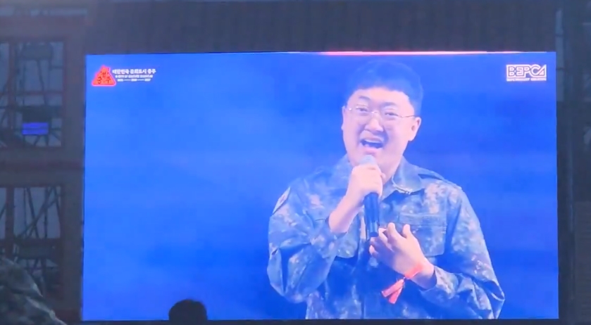 그러나 곧 무대에 오른 남성의 정체를 확인한 관객들은 혼돈에 빠졌다. 군복을 입고 등장한 남성은 우즈가 아닌 '충주맨'이었던 것.