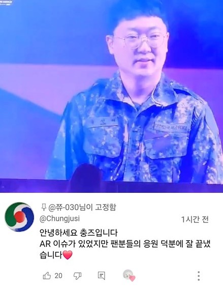 이 가운데 충주맨은 '드라우닝' 직캠에 충주시 공식 계정을 통해 "충즈(충주맨+우즈)입니다. AR 이슈가 있었지만 팬분들의 응원 덕분에 잘 끝냈습니다"라는 댓글을 남겼다.