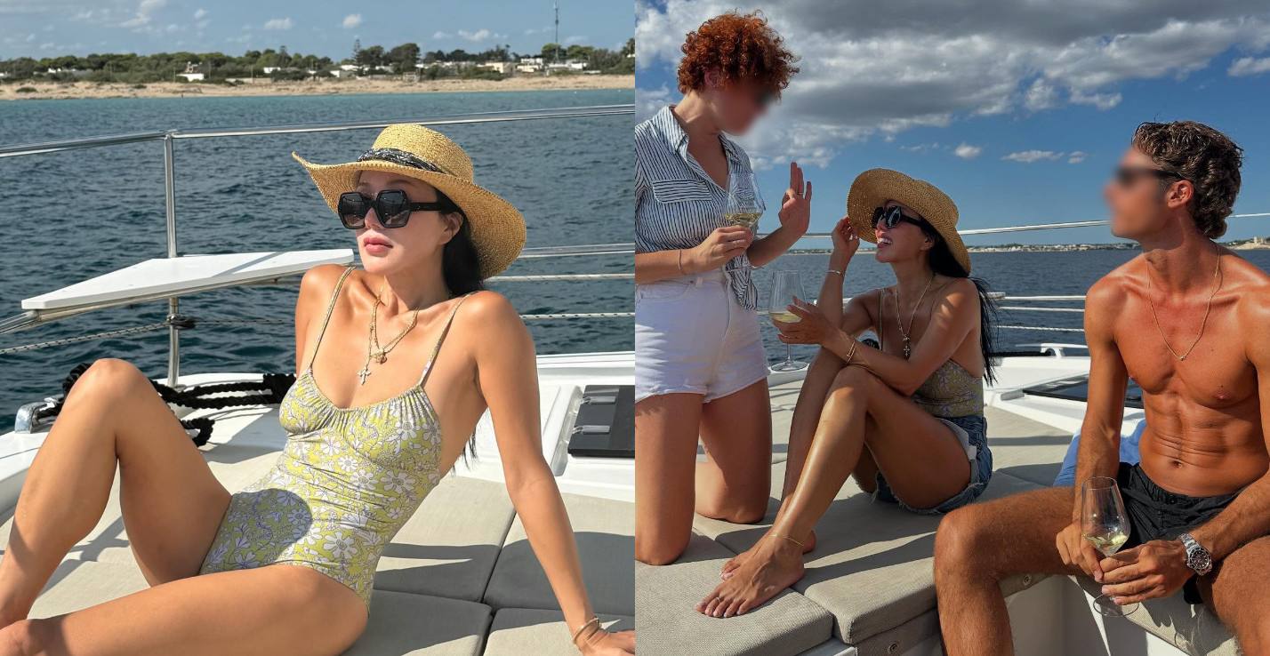 푸른 바다와 노을을 배경으로 와인을 즐기며 미소 짓는 모습은 세련되면서도 자연스러운 매력을 자아낸다. 특히 플라워 패턴의 모노키니 원피스 수영복과 청반바지로 완성한 리조트 룩은 50대라는 나이가 무색할 만큼 동안 미모와 탄탄한 몸매를 부각시켰다.