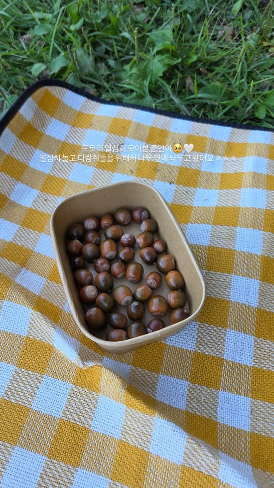 이어 손연재는 도토리 사진을 올리며 "도토리 열심히 모아본 준연이. 열심히 놀고 다람쥐들을 위해서 나무 옆에 놔두고 왔다"라고 덧붙였다.